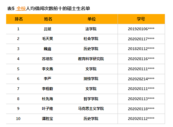 2019级硕士生谢苗苗同学和李彤彤同学,分别以第四名和第七名的成绩,位列硕士生在馆时长前十名,2020级硕士生毛天昊以第二名的成绩,位列硕士生借阅数量前十名。