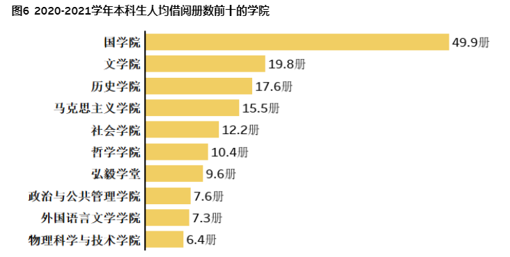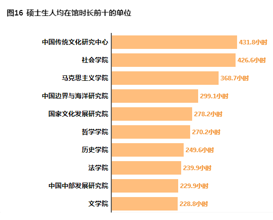 本科生人均入馆86.9次、人均在馆250.8小时,位列全校第一;硕士研究生人均入馆150.2次、人均在馆426.6小时,位列全校第二。