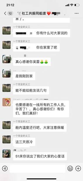 被“婉拒”后,团队并没有放弃,他们明白,医生们在这种“应激”的状态下,压力非常大,很多的组织、梳理、管理工作他们是无暇顾及的,而医护人员是从不同医院临时抽调组成,专业对口率低、相互了解少。而同时,患者对方舱医院运作不熟悉,也难免因为担心“交叉感染”而出现焦虑情绪,所以社工志愿者在线上的协调、组织、宣导等工作是非常有必要的。