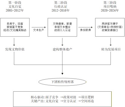报告创新性地运用行动者网络理论(ANT),摒弃了将传统村落视为静态历史遗存的传统视角,转而将其理解为多方行动者共同“制造”的产物。研究揭示,下团柏古村落的“制造”历程,始于村庄内部精英由面子竞争推动的文化自觉,承于家谱编修和历史叙事构建,最终通过申报省级文保单位与“传统村落”这一关键环节完成身份建构。