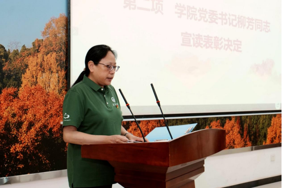 党委关于表彰2024-2025学年度先进党支部、优秀共产党员和优秀党务工作者的决定》,授予本科生党支部、2022级硕士研究生第一党支部、2023级硕士研究生第一党支部“先进党支部”荣誉称号,授予陈昫、陈珂丽同志“优秀党务工作者”荣誉称号,授予王子明等22名同志“优秀共产党员”荣誉称号。会上还通报了2024年度党支部书记述职评议考核和民主评议党员结果。在随后的讲话中,柳芳同志回顾了中国共产党104年波澜壮阔的奋斗历程,她勉励受到表彰的先进党支部和优秀共产党员、优秀党务工作者珍惜荣誉,不忘初心、牢记使命,持续发挥示范引领作用。希望各党支部和全体共产党员,要以先进为榜样,用国家的大事业磨砺真本领,在学习和实践的砥砺中不断成长,为实现中华民族伟大复兴而挺膺担当!