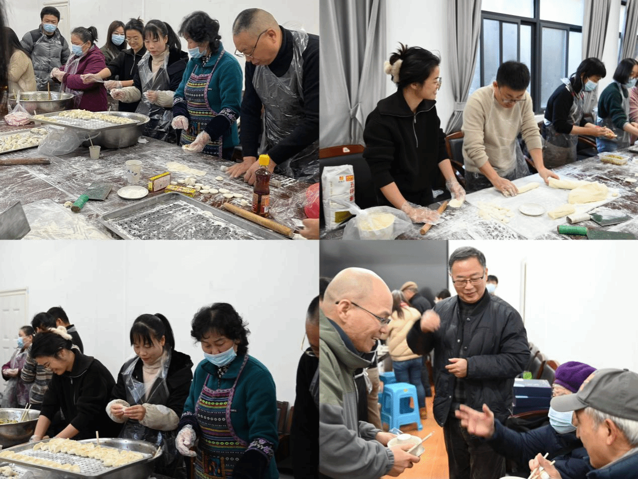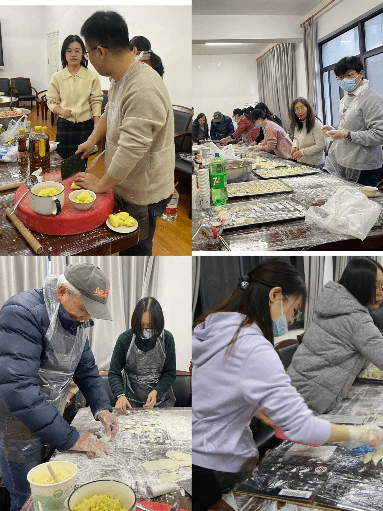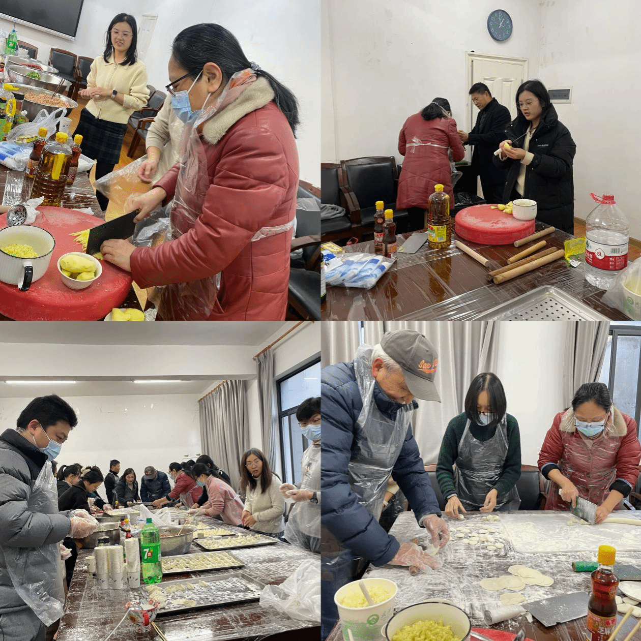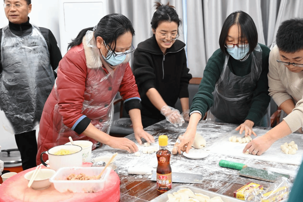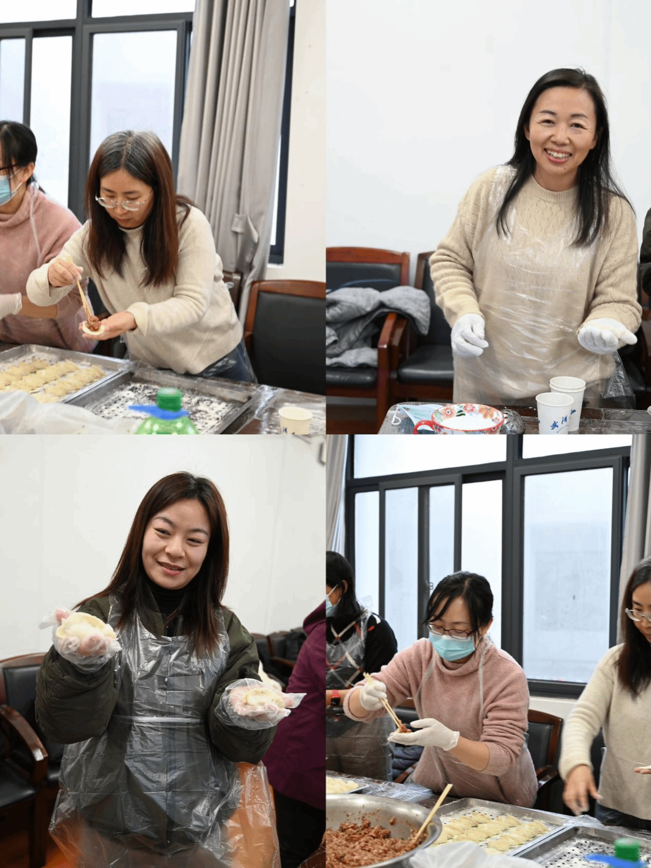 下午两点起教职工们陆续到达现场,积极参与到包饺子过程中,大家互相帮助互相学习,欢声笑语不断,现场气氛非常热烈。第一次成功包出一枚饺子的年轻老师们还自豪地举起“人生第一饺”向大家展示,成功的喜悦之情洋溢脸庞。
