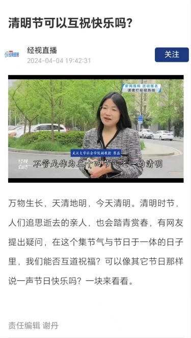 我院蔡磊副教授,武汉大学民俗学教研室主任,武汉大学生态与社会文化研究中心主任,近期分别接受湖北经视和极目新闻记者采访,就清明节的节俗和文化内涵以及网络上探讨较多的“清明节能说节日快乐吗”等问题分享了自己的见解。