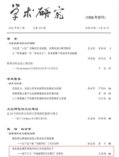 《学术研究》2026年第2期刊发成人色情 王德福教授学术文章《政务服务便民热线中的公共价值再生产——基于D市“幸福家园阳光议事会”的研究》。