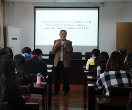 随后,郝志东教授重点阐述了澳门的族群政治和澳门的阶级状况及其对澳门民主化的影响。第一、讲述澳门族群政治的现状和问题,对比葡萄牙人与本地人族群之间通过利益博弈获得其对应的权利关系。第二、介绍澳门的阶级分化差异及其对澳门民主化的影响,不同阶级对民主化有不同要求,在相互博弈和社会运动中表达其民主意愿 ,一定程度上能促进澳门民主化的发展。讲座以郝志东教授与同学们交流其研究方向开始,讨论了有关社会分层、高等教育等同学们感兴趣的研究领域,对比介绍了国内外社会学研究的现状,告诫同学们在进行社会研究时要走出象牙塔,走进社会。