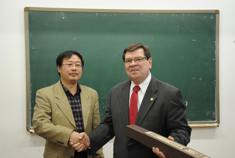 在师生交流会中,校长拉瑞·迪茨向大家介绍了伊利诺伊州立大学的基本情况,向同学们发出了前往伊利诺伊斯州立大学学习、进修与交流的邀请,并与同学们就互访交流问题进行了深入交流,分享了在求学、交流、读书、生活上的许多经验。校长专门提到社会学系系主任林曾教授作为伊利诺伊州立大学终身教授,在两校交流中起到了重要的桥梁作用。大家都希望双方能建立长期合作关系,推动未来更加便捷频繁的互动与交流。社会学系十余名本科生、硕士、博士研究生参与了座谈。会后,社会学系副系主任徐炜赠与了校长迪茨一行纪念品。