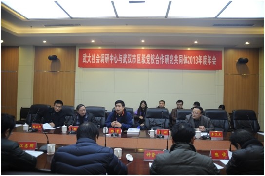 为进一步加强高校与政府科研机构合作,整合科研力量和社会资源,互惠互利,共同提高社会科学研究水平,为武汉市的社会建设与社会管理创新做出更大贡献,由武汉大学社会调查研究中心提议召开的“武汉大学社会调查研究中心与武汉市区级党校合作研究共同体2013年度年会”于2014年1月14日在东湖之滨、珞珈山下的珞珈山庄举办。武汉大学社会学系党总支书记李玉龙、主任林曾教授、社会发展研究所所长罗教讲教授、青山区政协经济科技委员会张明学主任以及武汉市13区委党校校长汇聚一堂,共商合作事宜。