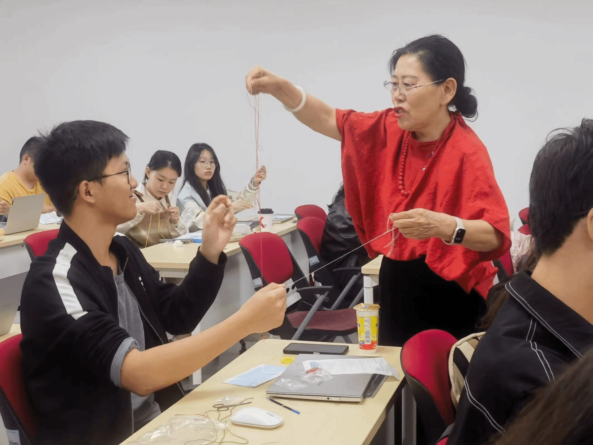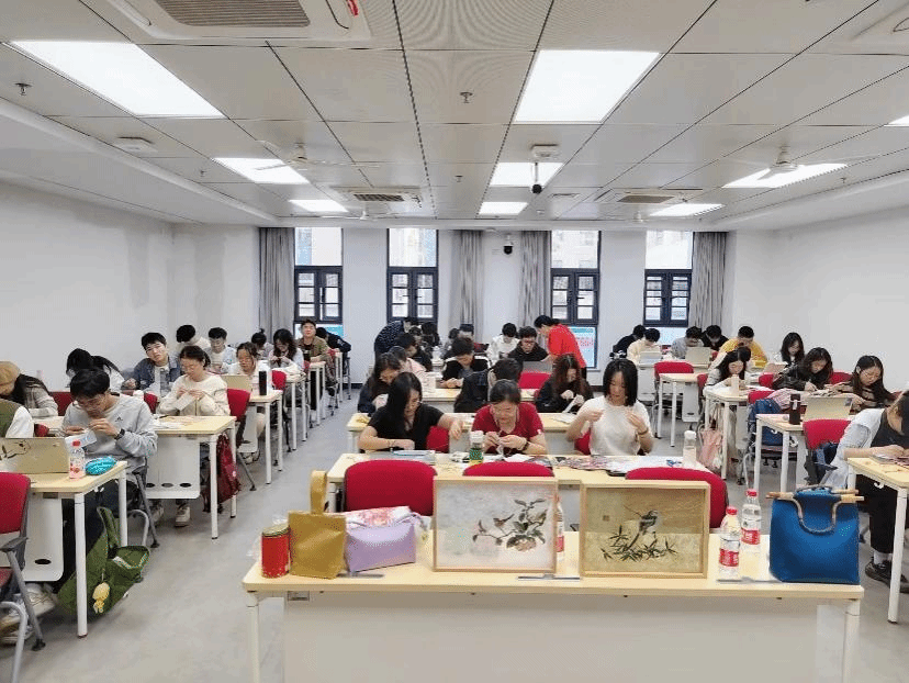 一时之间,平时手握纸笔的大学生们,纷纷摇身一变成了“大绣才”。有的同学穿针引线中尽显青涩,不时向老师求助;有的同学虽是初学者却“天赋异禀”,早已绣出平整美观的花纹;还有几位同学更是技高一筹,甚至能为身边人指点一二。