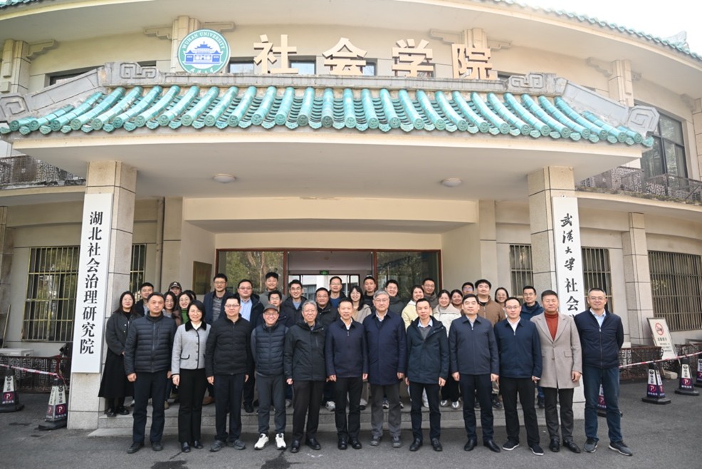 为深入学习贯彻党的二十届四中全会精神,探讨中国特色社会主义社会治理之路,2025年12月27日上午,“湖北省社会治理创新与社会工作高质量发展座谈会”在武汉大学社会学院成功召开。座谈会由湖北社会治理研究院主办,湖北省委社会工作部部长蒋星华、副部长陆建义一行十人出席座谈会,湖北社会治理研究院共三十多名专家学者参加了座谈。