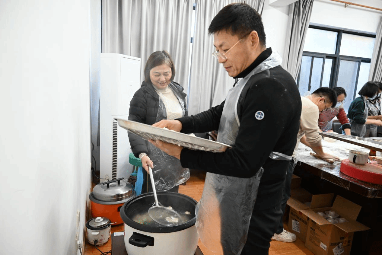 下午五点,两口大锅同时开始煮饺子,忙活了一下午的教职工们对集体的劳动成果分外期待,纷纷拿着提前分配好的餐具热切等待。饺子煮好后,掌勺的桂晓伟主席和黄锦琳副主席一起给教职工们盛饺子。