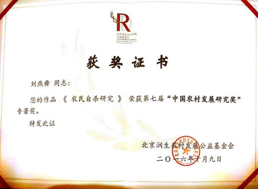 我系刘燕舞副教授的著作《农民自杀研究》(社会科学文献出版社,2014年8月)荣获第七届“中国农村发展研究奖”著作奖。