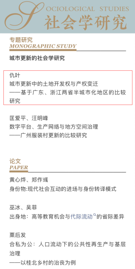 《社会学研究》2025年第6期刊发我院副教授仇叶的学术文章《城市更新时期的土地开发权与产权变迁——基于广东、浙江两省半城市化地区的比较研究》。
