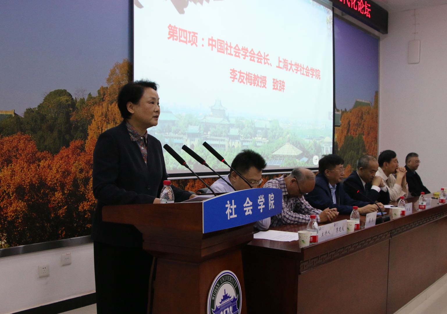 李友梅代表中国社会学会向武汉大学对社会学学科的支持表示衷心的感谢,对社会学院的成立致以热烈的祝贺。她认为,武汉大学社会学进入了一个快速发展的新时期,在学生培养方面别具一格,在科研成果方面独具特色,在社会影响方面成绩斐然。武汉大学作为中部地区社会学研究的重镇,正在不断发挥它更大的作用。习近平总书记在哲学社会科学工作座谈会上的讲话中指出,在解读中国实践、构建中国理论上,我们应该最有发言权,但实际上我国哲学社会科学在国际上的声音还比较小,还处于有理说不出、说了传不开的境地。中国社会学界已经达成一个重要共识,那就是要尽快构建具有中国特色的社会学学科体系、学术体系和话语体系,在中国经验基础上提炼标识性概念,在国际学术规范前提下锻造理论框架,在哲学社会科学领域推陈出新、引领学术潮流。她强调,武汉大学社会学院的成立对武汉大学和中国社会学学科发展都具有重要意义,并对社会学院提出三点希望:一是希望能够将科学研究与国家需求相结合,服务国家发展和推动社会进步,为构建中国特色的社会学话语体系做贡献;二是希望抓住新时代的新机遇,打造特色鲜明、优势突出的武大社会学学科;三是希望在党委的领导下,抓住立德树人的育人宗旨,培养出一大批富有国家情怀、志存高远、视野开阔、专业技能扎实的优秀人才。