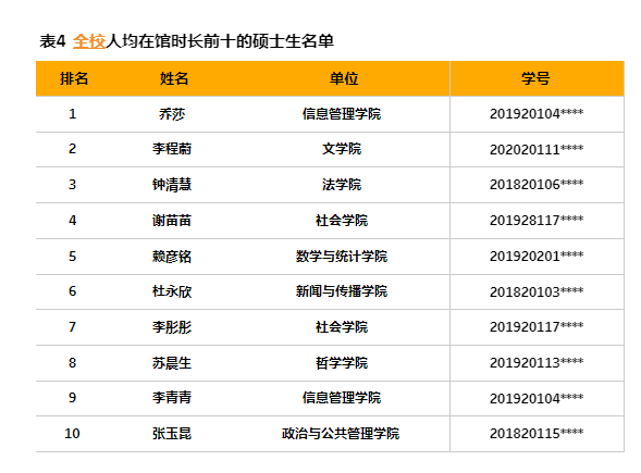 2019级硕士生谢苗苗同学和李彤彤同学,分别以第四名和第七名的成绩,位列硕士生在馆时长前十名,2020级硕士生毛天昊以第二名的成绩,位列硕士生借阅数量前十名。