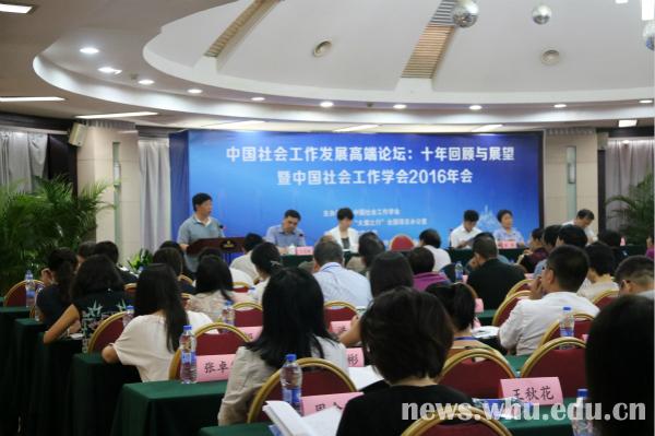 由中国社会工作学会和李嘉诚基金会“大爱之行”项目办公室联合主办,武汉大学承办的“中国社会工作发展高端论坛:十年回顾与展望”暨中国社会工作学会2016年会于8月25日至26日在我校隆重举行。来自国家民政部、全国总工会、共青团中央、湖北省民政厅等相关部门的领导以及200余位专家学者、相关部门负责人、一线工作者与会。民政部副部长顾朝曦、中国社会工作学会会长王思斌、武汉大学常务副校长冯友梅出席开幕式并致辞。