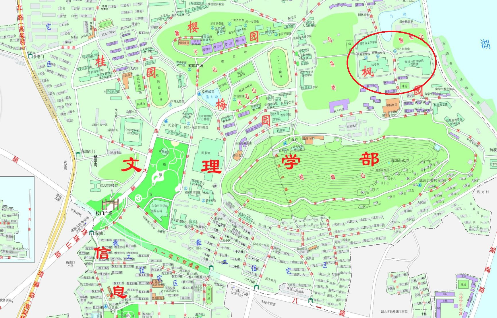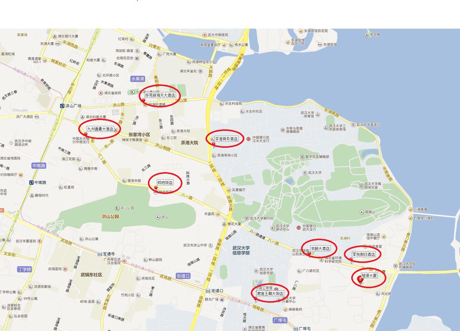 四、会场设置 1、开幕式主会场: 武汉大学经济与管理学院主报告厅(凭代表证入场) 2、开幕式分会场: 武汉大学外语学院报告厅(凭代表证入场) 3、闭幕式会场: 武汉大学经济与管理学院主报告厅 4、分论坛会场: 武汉大学经济与管理学院、法学院、外语学院三个学院内的各会议厅、报告厅及多功能教室、华中师范大学桂园宾馆。 五、会议交通 1. 接送安排: ①本次会议不安排接机、接站; ②会议期间,大会安排会议专用车辆负责从各会议协议宾馆到会场之间的往返接送,会议代表凭证乘车。上午前往会场的乘车时间一般为8;00左右,晚上返回宾馆的乘车时间为晚餐后18:30——19:00。 2. 酒店交通示意图 酒店交通示意图.jpg 3. 武汉大学校园内地图(用圈标示之处为年会主会场与各分论坛会场所在地) 武汉大学校园内地图(用圈标示之处为年会主会场与各分论坛会场所在地).jpg 六、会务服务机构 年会筹备组联系人: 北京:吕红新 010-85195573 13521077281 [email protected] 武汉:黄锦琳 027—68756650 , 15827103298,电子邮箱:[email protected] (传真) 027-68753859 会议住宿联系人:余 园027-68753860 13971127599 会议交通联系人:陈倩 027-68753859 15071177069 分论坛联系人:张杨波 13476260165 电子邮箱:[email protected] 温馨提示 (一)为保障会议的顺利进行,请会议代表遵守大会作息时间和各项规定 (二)会议代表凭代表证进入开幕式会场,凭代表证参加分论坛组织的各项活动 (三)会议代表凭当日餐券按照会议安排就餐 (四)会议代表参加会议或集体活动,请遵守大会安排 (五)会议期间,未经大会同意,不准在驻地、会场召开新闻发布会,不准散发图书资料、推销产品 (六)参加会议期间,请将手机关闭或置于震动状态,以便会议顺利进行 (七)个人所带文件和贵重物品请妥善保管 (八)大会不安排考察参观活动。有考察参观活动的代表可自行联系旅行社。 (九)武汉市7月9日~12日天气情况:(网上武汉30天天气预报,不一定准确)